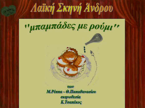 – 17 ,18, 19, 20,21, 24, & 25 Απριλίου, «Μπαμπάδες με ρούμι», των Μ. Ρέππα και Θ. Παπαθανασίου σε σκηνοθεσία Κώστα Τσαπέκου, από τη θεατρική ομάδα “Λαϊκή Σκηνή Άνδρου”, για πληροφορίες και εισιτήρια απευθυνθείτε στο Κατάστημα “Παραπόρτι”, στη Χώρα Άνδρου, τηλ. 2282-0-23777