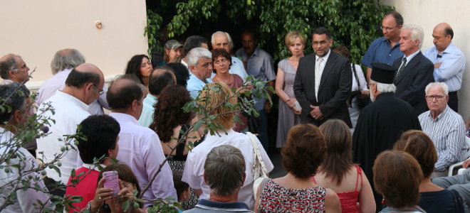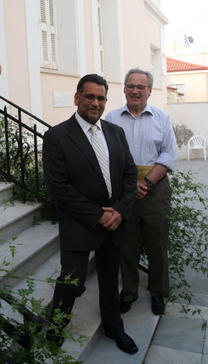 Στην υποδοχή ο Ευάγγελος Γρυπιώτης με τον Αλκιβιάδη Τάττο, χορηγό της έκδοσης του καταλόγου της έκθεσης
