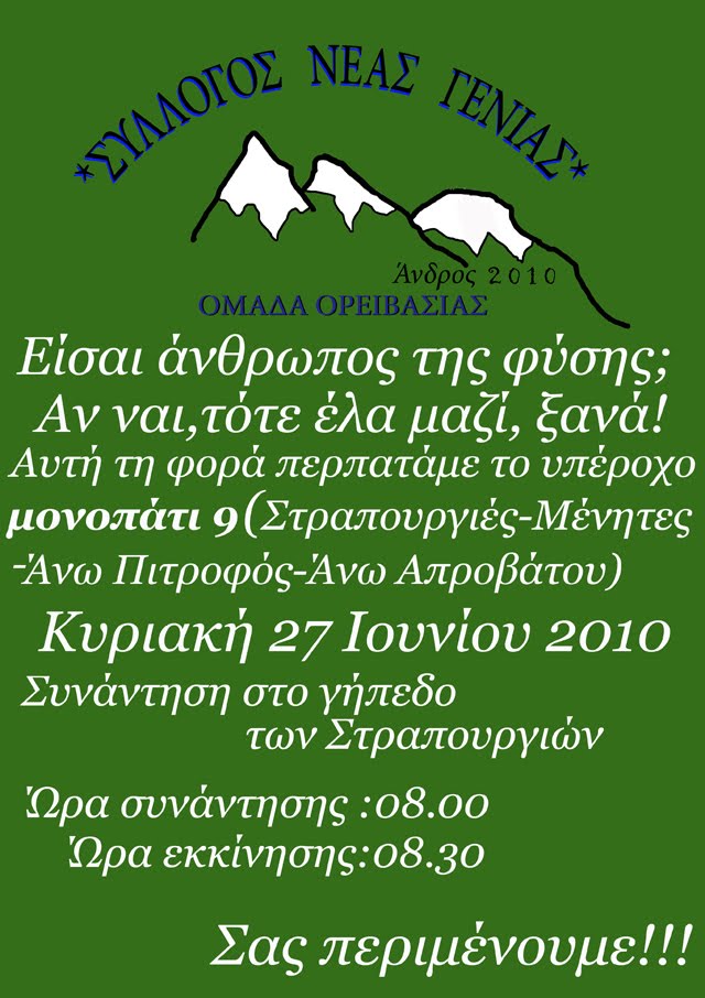 Αγαπάτε την φύση;Τότε η λύση είναι άλλη μια βόλτα με την ορειβατική ομάδα του συλλόγου Νέας Γενιάς!Ας απολαύσουμε το όμορφο μονοπάτι με καλή παρέα προσφέροντας στους εαυτούς μας ο,τι καλύτερο,υγεία, ευεξία και καθαρό αέρα!Οι φωτογραφίες είναι από την προηγούμενη πεζοπορία στο μονοπάτι 8 ( ΑΡΧΕΙΟ ΦΩΤΟ ΑΝΔΡΟΣ) .