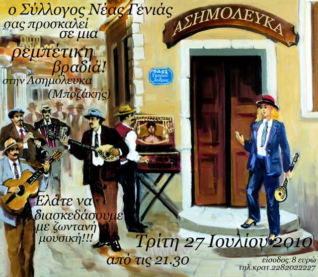 Ωραία ιδέα και πάλι!Ρεμπέτικη βραδιά!Μου αρέσει που αυτός ο σύλλογος παρότι είναι σύλλογος νέας γενιάς πάντα θυμάται τους παλιούς και τους τιμά!Μπραβο παιδιά!