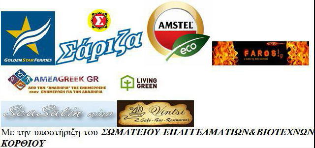 GOLDEN STAR FERRIES, AMSTEL ECO, ΣΑΡΙΖΑ, BINΤΣΙ, SEA SATIN, ELENI ROOMS, ΑΜΕΑ ΦΑΡΟΣ FM χορηγός επικοινωνίας, LIVING GREEN, ΣΩΜΑΤΕΙΟ ΕΠΑΓΓΕΛΜΑΤΙΩΝ & ΒΙΟΤΕΧΝΩΝ ΚΟΡΘΙΟΥ