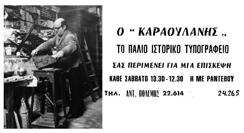 Ο τελευταίος τυπογράφος Αντώνης Πόλέμης σας περιμένει για μία επίσκεψη στο παλιό ιστορικό τυπογραφείο της Άνδρου κάθε Σάββατο 10:30- 12:30 ή με ραντεβού που θα κλείσετε με τον ίδιο στο τηλέφωνο 22820-22614. Θα σας δείξει τον τρόπο που γίνονταν παλιά η εκτύπωση σε χαρτί και θα μπορέσετε να δείτε στο αρχείο του εκτυπωτικές εργασίες που έγιναν κατά τη διάρκεια λειτουργίας του τυπογραφείου.