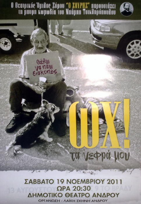 Φιλοξενούμενος της Λαϊκής Σκηνής Άνδρου ,ο 32χρονος συριανός θεατρικός όμιλος θα δώσει μία παράσταση του έργου του Μπάμπη Τσικληρόπουλου “Ωχ, τα νεφρά μου!”. Πρόκειται για μία πικρή κωμωδία που αναφέρεται στις προσδοκίες και τις περιπέτειες δύο περιθωριακών τύπων οι οποίοι προσπαθούν να επιβιώσουν με αξιοπρέπεια. Ένα έργο που υμνεί τη φιλία και την ανθρωπιά.