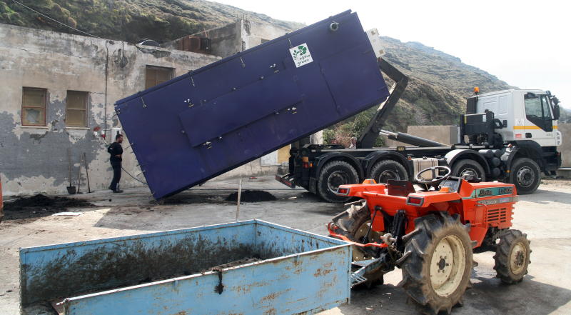 Το υλικό που προέκυψε, με την βοήθεια ανθρώπων του δωρητή του κομποστοποιητή που χρειάστηκε να μπουν και μέσα στο μηχάνημα λόγω της υψηλής υγρασίας και λασπώδους υφής του κομπόστ, επικουρούμενοι από τον οδηγό του δημοτικού φορτηγού με γάντζο που κρατούσε σε κλίση το κοντέινερ , εκφορτώθηκε μετά από 3,5 ώρες περίπου και οδηγήθηκε σε άλλο χώρο για ωρίμανση όπου αργότερα θα ελεγχτεί η καταλληλότητα του για χρήση ως «λίπασμα».