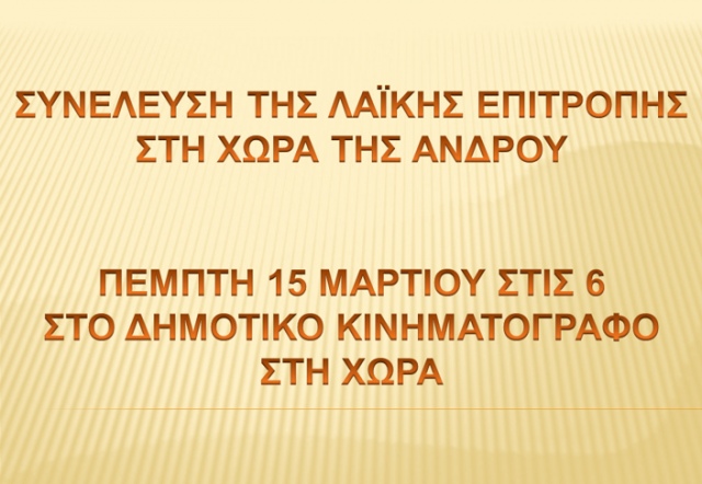 Καλούνται οι συμπολίτες μας στη συνέλευση της Λαϊκής Επιτροπής Άνδρου την Πέμπτη 15 Μαρτίου, 18:00, στο Δημοτικό Κινηματογράφο της Χώρας
