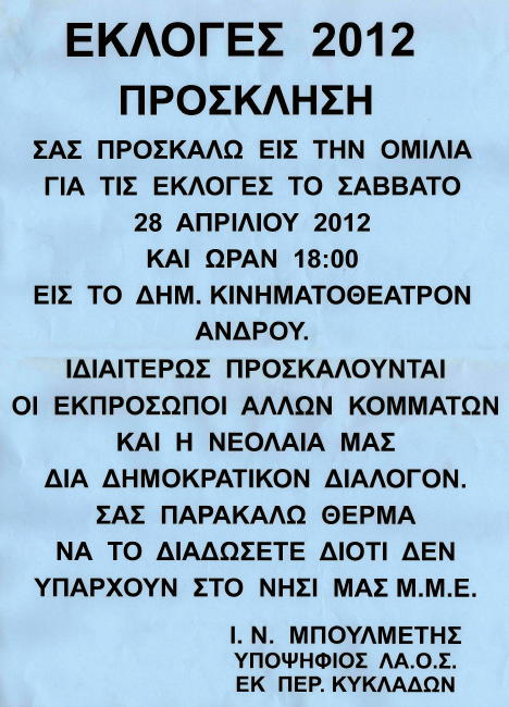 Κυριε Μπουλμετη ευχαριστω θερμως δια την προσκλησιν και με ολον τον σεβασμον μου(!!!), σας λεγω αγαπητε και εις εσας και εις τον κωλοτουμπαν αρχηγον σας…..να σαλταρετε μεχρι το στενο να δειτε αν ερχομαι!!!!!!!!!