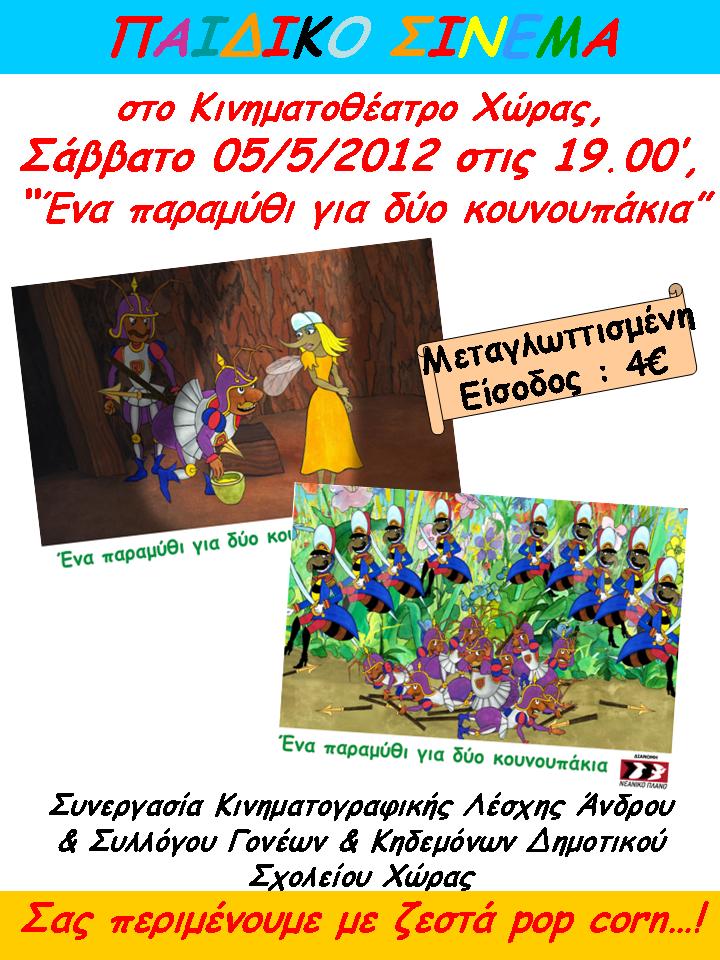 Τη Σκανδιναβική ταινία “ΜΙΑ ΙΣΤΟΡΙΑ ΓΙΑ ΔΥΟ ΚΟΥΝΟΥΠΑΚΙΑ” (A Tale of Two Mozzies), προβάλουμε σε συνεργασία με τον Σύλλογο Γονέων και Κηδεμόνων Δημοτικού Σχολείου Χώρας Άνδρου, για τους μικρούς μας θεατές. Πρόκειται για κινούμενο σχέδιο του Jannik Hastrup, από τη Δανία, παραγωγής του 2007, και διάρκειας 75′. Τα κουνούπια δεν είναι πάντα επιβλαβή έντομα. Μία ταινία δράσης, αλλά χωρίς πιστολίδι. Γεμάτη όμως από χιούμορ, αναρχία και ευρηματικότητα. Ένα εξαιρετικό παραμύθι γεμάτο πολύχρωμα έντομα με προσωπικότητα και μουσικά νούμερα.