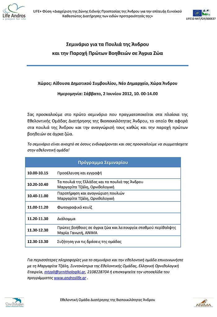 Το πρώτο σεμινάριο στα πλαίσια της Εθελοντικής Ομάδας Διατήρησης της Βιοποικιλότητας για την αναγνώριση των πουλιών της Άνδρου και την παροχή πρώτων βοηθειών σε άγρια ζώα θα πραγματοποιηθεί