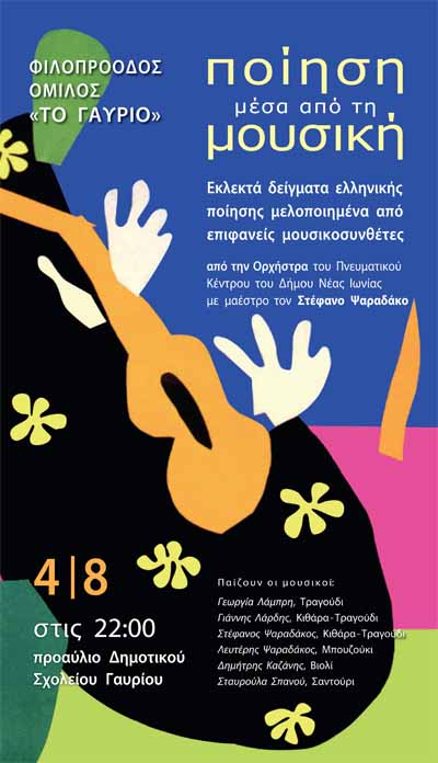 Η εκδήλωση είναι προγραμματισμένη για το Σάββατο 4 Αυγούστου 2012 και ώρα 22:00, στο προαύλιο του Δημοτικού σχολείου Γαυρίου.