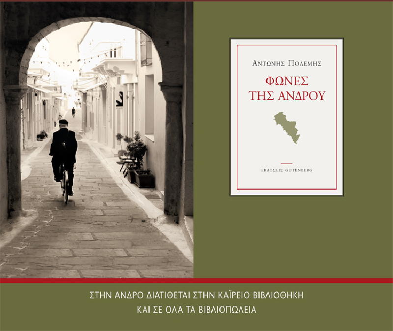 ο Αντώνης Πολέμης (1925-2012). Έζησε στο νησί του όλα του τα χρόνια, τυπογράφος και έμπορος, βιβλιοχαρτοπώλης και πράκτορας εφημερίδων, προνομιούχος κληρονόμος δυο πλούσιων σε μνήμες οικογενειακών παραδόσεων: των καραβοκυρέων Πολέμηδων από τις Στενιές και των Καραουλάνηδων της Χώρας, τυπογράφων και εμπόρων. Στα χρονογραφήματα της συναγωγής, αντλώντας αφορμές κυρίως από τη Φωνή της Άνδρου, την εφημερίδα που εκδιδόταν τα πρώτα μεταπολεμικά χρόνια στο οικογενειακό τυπογραφείο, συνδυάζει τις αναδρομές στο παρελθόν με