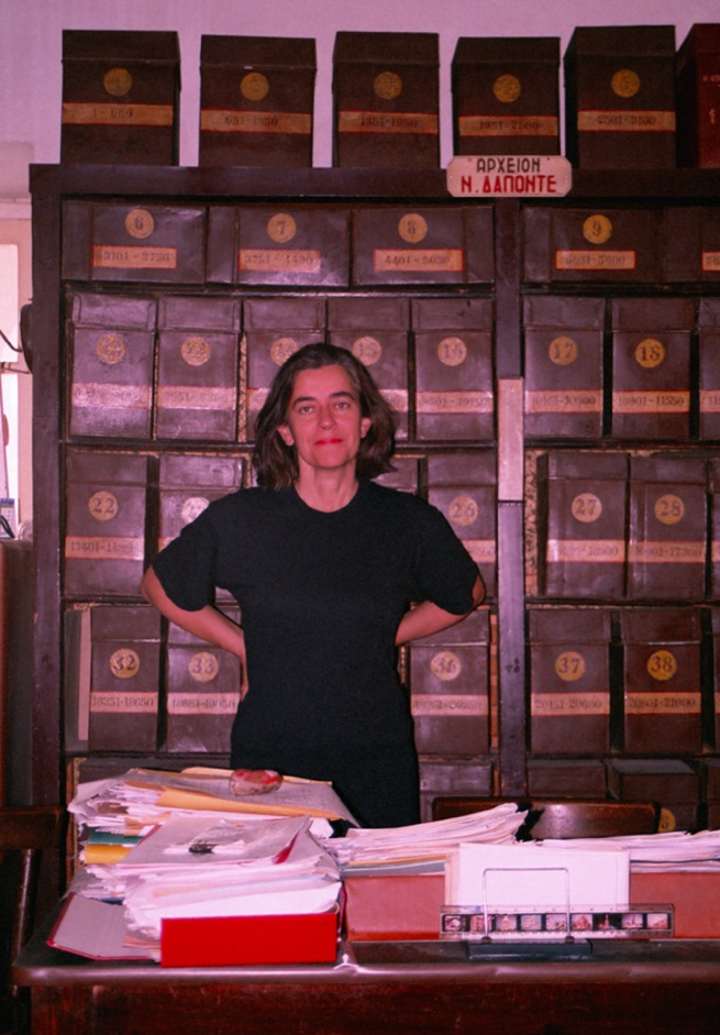 | Η Ιωάννα μπροστά στο αρχείο του συμβολαιογραφείου Τάσου Δημητρίου όταν έγραφε την Μικρά Αγγλία (1996) |
