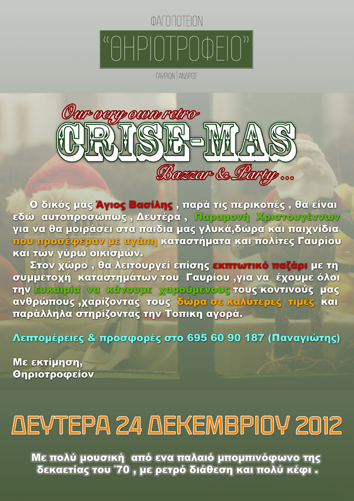 Ο δικός μας Άγιος Βασίλης , παρά τις περικοπές , θα είναι εδώ αυτοπροσώπως , Δευτέρα , Παραμονή Χριστουγέννων για να θα μοιράσει στα παιδιά μας γλυκά, δώρα και παιχνίδια που προσέφεραν με αγάπη καταστήματα και πολίτες Γαυρίου και των γύρω οικισμών. Στον χώρο , θα λειτουργεί επίσης εκπτωτικό παζάρι με τη συμμετοχή καταστημάτων του Γαυρίου ,για να έχουμε όλοι την ευκαιρία να κάνουμε χαρούμενους τους κοντινούς μας ανθρώπους ,χαρίζοντας τους δώρα σε καλύτερες τιμές και παράλληλα στηρίζοντας την Τοπική αγορά.
