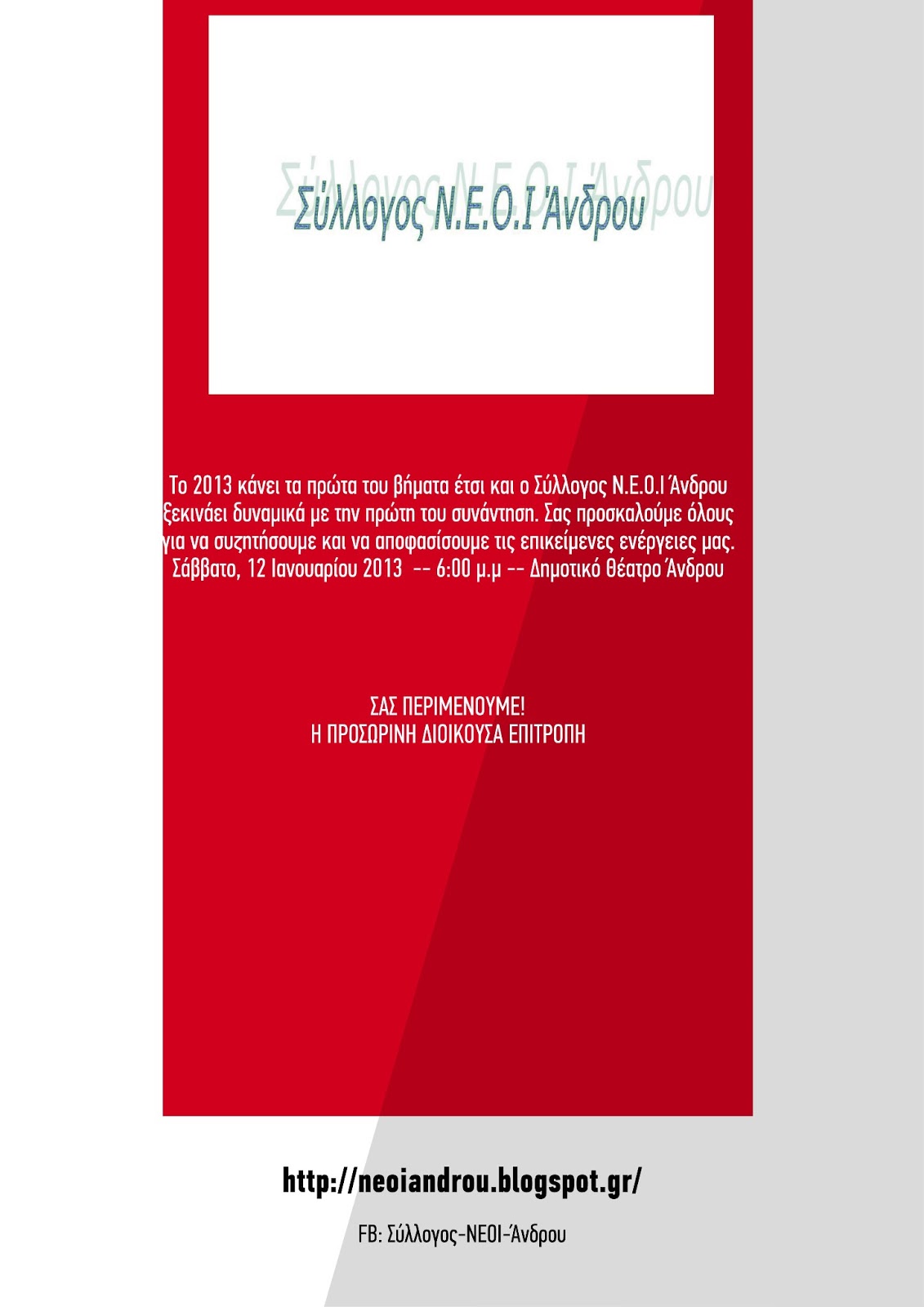 Σας ενημερώνουμε ότι η προκαθορισμένη μας συνάντηση το Σάββατο 12/1/2012 και ώρα 18.00 αναβάλλεται λόγω αναπάντεχου προβλήματος και θα σεπικοινωνήσουμε εκ νέου για την επόμενη συνάντησή μας εντός των ημερών.