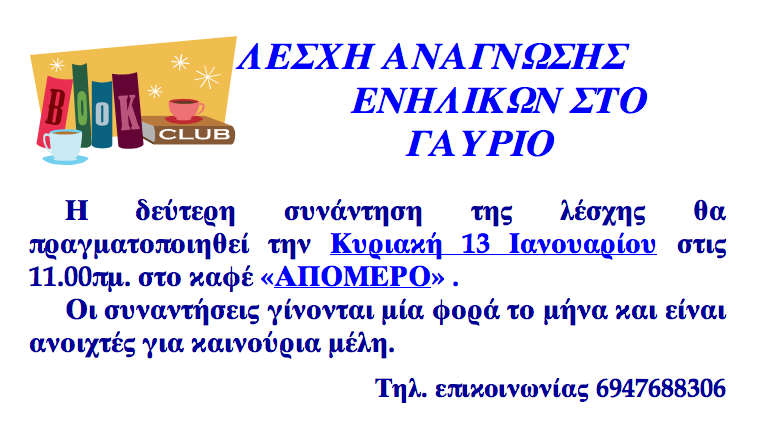Η δεύτερη συνάντηση της λέσχης ανάγνωσης Γαυρίου θα πραγματοποιηθεί την Κυριακή 13 Ιανουαρίου στις 11.00πμ. στο καφέ «ΑΠΟΜΕΡΟ».