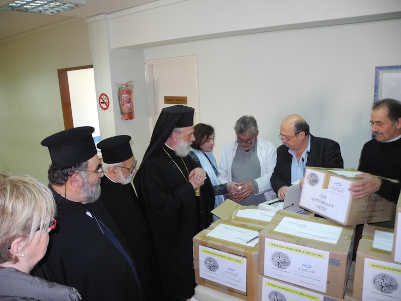 …στο «Κέντρο Υγείας», στη Χώρα, ο Σεβασμιώτατος Μητροπολίτης Σύρου κ. Δωρόθεος β΄ όπου παρουσία του Προέδρου του Δημοτικού Συμβουλίου και Δημοτικών Συμβούλων παρέδωσε την προσφορά στην Ιερά Μητρόπολη του Ιατρικού Συλλόγου Αθηνών και της ΜΚΟ της Ιεράς Αρχιεπισκοπής Αθηνών «ΑΠΟΣΤΟΛΗ». Ο Σεβασμιώτατος παραδίδοντας τα φάρμακα ευχαρίστησε τον Πρόεδρο του Ιατρικού Συλλόγου Αθηνών κ. Πατούλη και τον Διευθυντή της «ΑΠΟΣΤΟΛΗΣ» κ. Κώστα Δήμτσα, τονίσας ιδιαιτέρως το ενδιαφέρον τους και για ανασφάλιστους ασθενείς των νησιών και την προσφορά προς αυτούς δωρεάν των φαρμάκων τους.