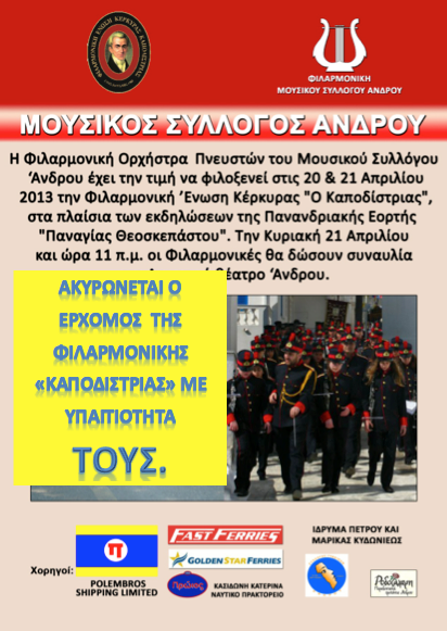 Συγχαριτήρια σε όλα τα μέλη της Φιλαρμονικής "Καποδίστριας" που θέλησαν να πραγματοποιήσουν το συγκεκριμένο ταξίδι, αλλα τελευταία στιγμή ακύρωσαν τη συμμετοχή τους, εκθέτοντας όχι μονο τον ίδιο τον Καποδίστρια, αλλα και τη Φιλαρμονική του Μουσικού Συλλόγου Άνδρου που διοργανώνοντας τις συγκεκριμένες εκδηλώσεις προσκάλεσε εδω και πολύ καιρό τον Καποδίστρια για να συμετέχει..