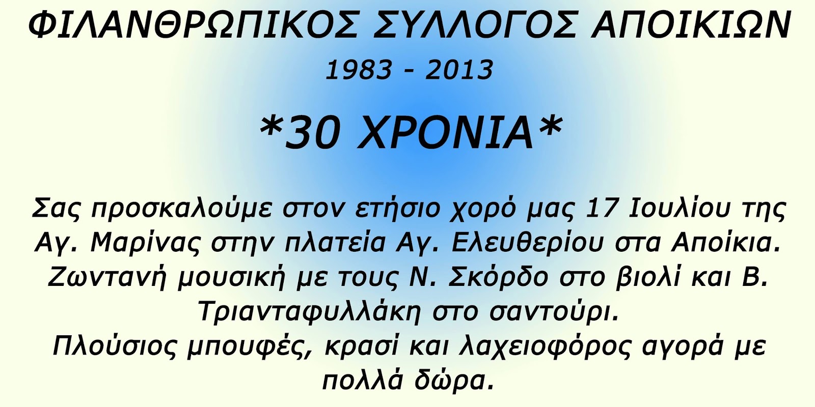 Στις 17 Ιουλίου στο πανηγύρι της Αγίας Μαρίνας, σας καλούμε στο χορό μας να γιορτάσουμε μαζί και να διασκεδάσουμε στην πλατεία Αγ. Ελευθερίου, Πύργος Περάκη στο Τρικόλι Αποικίων.
