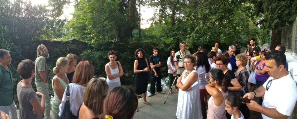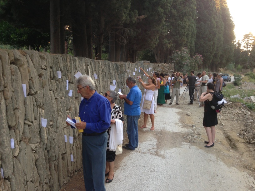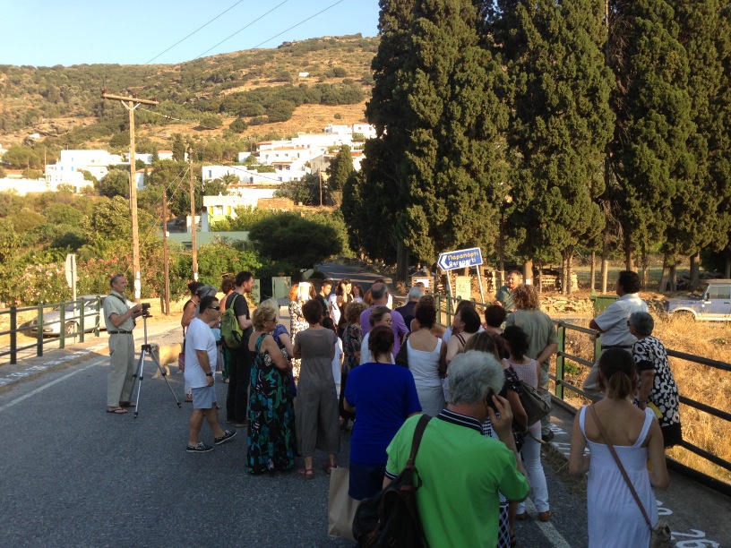 Πραγματοποιήθηκε χθές Παρασκευή 26 Ιουλίου η πρώτη ξενάγηση από την επιμελήτρια και τους καλλιτέχνες στα σημεία των εφήμερων εγκαταστάσεων που δημιούργησαν στην περιφέρεια του χωριού Λειβάδια κοντά στην Χώρα της Άνδρου, καθώς και η επίσκεψη αργότερα στην Καΐρειο Βιβλιοθήκη όπου υπήρχε έκθεση έργων μικρού μεγέθους των ίδιων καλλιτεχνών.
