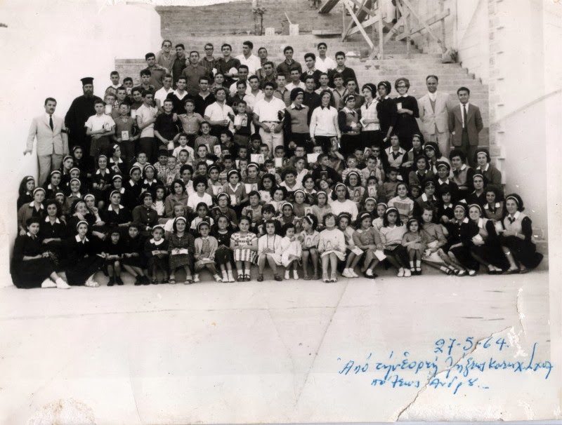 | 27-5-1964 στα σκαλιά της Θεοσκέπαστης με τα παιδιά του κατηχητικού (φωτογραφία : Μοσχούλα Κανάκη |