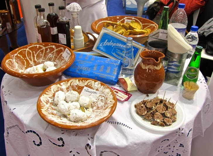από το τυροκομείο Κολίτσας, λουκάνικα από τα χοιροσφάγεια του Πολιτιστικού Συλλόγου Απροβάτου, νερό ΣΑΡΙΖΑ (εμφιαλωμένο και ανθρακούχο) τσίπουρο και λικέρ «καρυδάκι», «πικραμύγδαλο», «βύσσινο» από ανδριώτισες νοικοκυρές, παξιμάδια από τον φούρνο του κ. Κώστα Γαρύφαλλου στον πεζόδρομο της Χώρας της Άνδρου, τα οποία κερνούσε η ανδριώτισα μέλος του Συλλόγου Γυναικών Άνδρου κ. Φραγκούλα Ραϊση ντυμένη με παραδοσιακή ενδυμασία.
