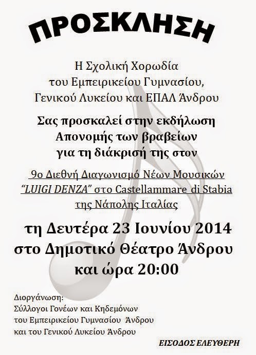 Η εκδήλωση απονομής των βραβείων πραγματοποιήθηκε στο γεμάτο κόσμο Δημοτικό Θέατρο, σε κλίμα συγκίνησης και χαράς. Ήταν έκδηλη η ικανοποίηση όσων απόλαυσαν τόσο την παρουσίαση των τραγουδιών από την χορωδία αλλά και του σύντομου φιλμ από την αποστολή στην Ιταλία. Για μια ακόμη φορά ευχαριστούμε όσους συνέβαλλαν οικονομικά και ηθικά στην πραγματοποίηση της αποστολής, πιστεύουμε ότι αξιοποιήσαμε τα χρήματα και την εμπιστοσύνη τους με τον καλύτερο δυνατό τρόπο και τα παιδιά μας έγιναν πρέσβεις του σπουδαίου κομματιού των συμπατριωτών μας: των εργατικών, των υπεύθυνων, των πολιτισμένων, των ανθρώπων που ονειρεύονται και αγωνίζονται για το καλύτερο (ακόμη και όταν οι συνθήκες δεν είναι ευνοϊκές), της απλόχερης προσφοράς, της αμφίδρομης εκτίμησης χορηγού και ευεργετούμενου. Συγχαρητήρια σε όλους! Ντίνα Στυλιανου