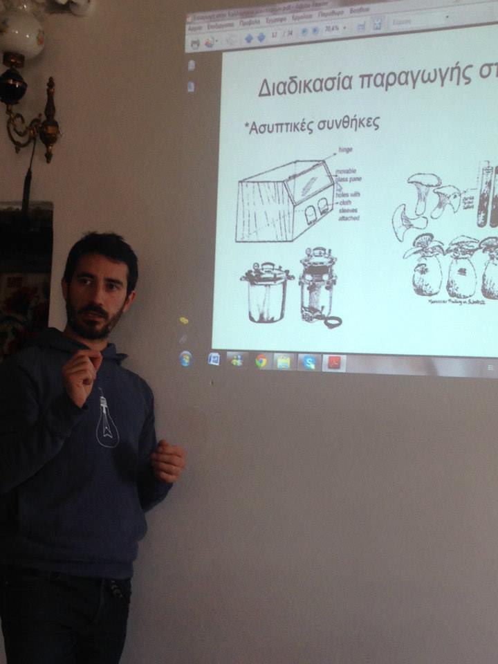 Οι εισηγητές του σεμιναρίου, Διδάκτωρ τμήματος Βιολογίας του Παν. Πάτρας Ηλίας Πολέμης και υπ. Διδάκτωρ Γεωπονικού Πανεπιστημίου Αθηνών Γιώργος Κουτρώτσιος, μύησαν τους 25 συμμετέχοντες στο μαγικό κόσμο των μανιταριών.