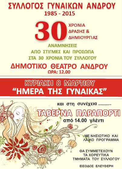 Την Κυριακή 8 Μαρτίου 2015, στο Δημοτικό Θέατρο Άνδρου, ο Σύλλογος Γυναικών Άνδρου δεν γιόρτασε μόνο την ημέρα της Γυναίκας, αλλά και τα 30 χρόνια παρουσίας του στην ζωή του νησιού.