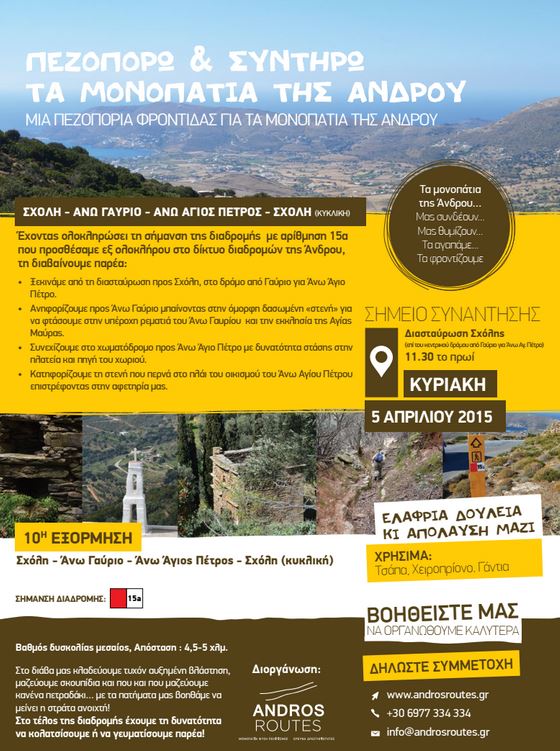 Έχοντας ολοκληρώσει τη σήμανση της διαδρομής με αρίθμηση 15α [Σχόλη- Άνω Γαύριο – Άνω Άγιος Πέτρος- Σχόλη (κυκλική)], που προσθέσαμε εξ ολοκλήρου στο δίκτυο διαδρομών της Άνδρου, τη διαβαίνουμε παρέα: