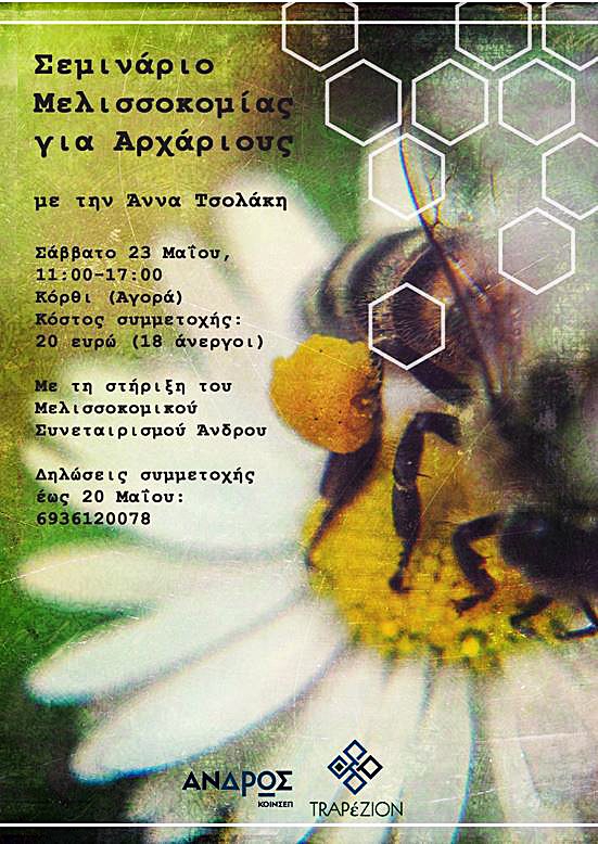 Η Κοινωνική Συνεταιριστική Επιχείρηση Άνδρου διοργανώνει στην έδρα της το Σάββατο 23 Μαΐου 2015 από τις 11 το πρωί έως τις 5 το απόγευμα σεμινάριο Μελισσοκομίας για αρχάριους με την Άννα Τσολάκη.