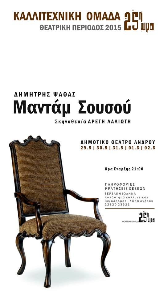 Η καλλιτεχνική ομάδα ”25η Ώρα” σας προσκαλεί στο έργο του Δημήτρη Ψαθά η ”Μαντάμ Σουσού” σε σκηνοθεσία Αρετής Λαλιώτη.