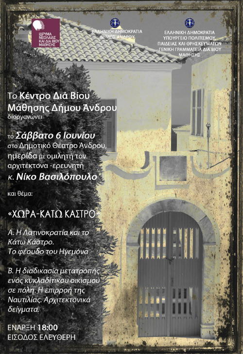 Το Κέντρο Δια Βίου Μάθησης ΑΝΔΡΟΥ διοργανώνει το Σάββατο 6 Ιουνίου, στις 6:00 μ.μ στο Δημοτικό Θέατρο Χώρας Άνδρου, ημερίδα με ομιλητή τον αρχιτέκτονα-ερευνητή κ. Νίκο Βασιλόπουλο.