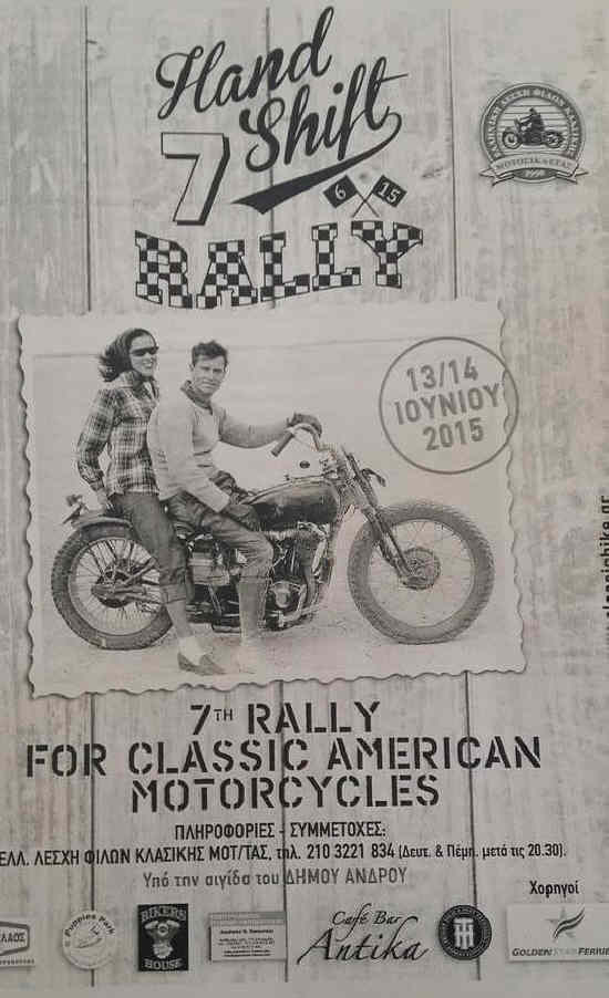 Το Σαββατοκύριακο 13 και 14 Ιουνίου 2015, η Άνδρος θα φιλοξένισε το 7ο ραλλυ κλασικής μοτοσικλέτας που διοργάνωσε η Ελληνική Λέσχη Κλασσικής Μοτοσυκλέτας.