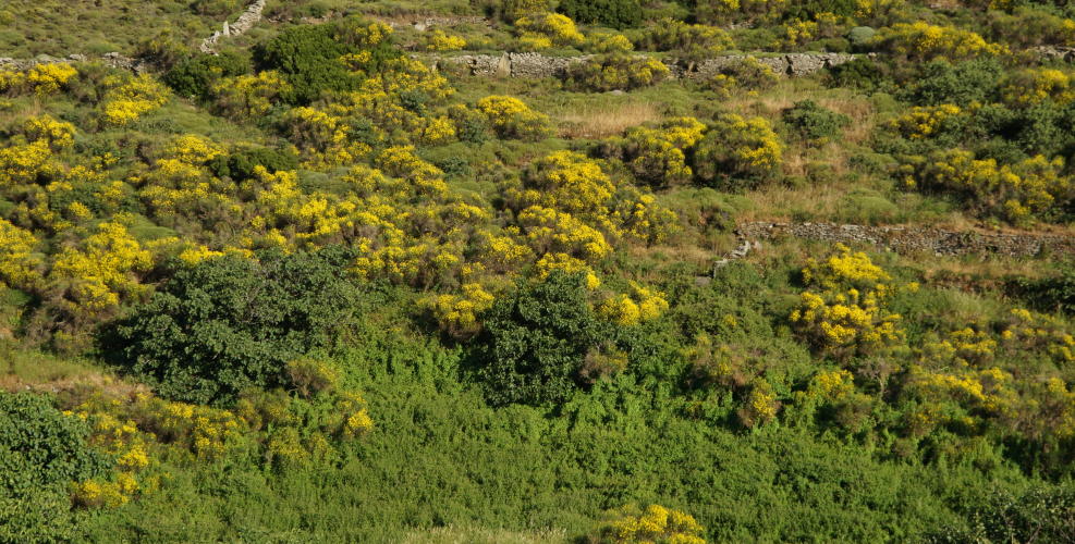 Τα άνθη του είναι κίτρινου χρώματος, αρωματικά, σχηματίζουν βότρυες και Μάϊο, Ιούνιο πολλά βουνά και εγκαταλελειμμένα κτήματα της Άνδρου είναι κίτρινα από τις πολλές ασπαρτιές .