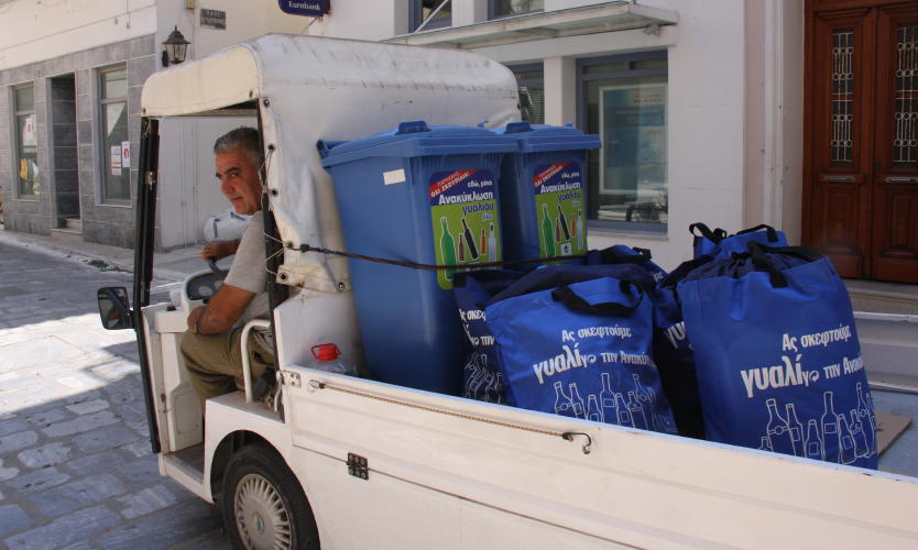 Κάθε πρωί το άσπρο αυτοκινητάκι μαζεύει τις γεμάτες από μπουκάλια τσάντες, τις αδειάζει στους μεγάλους κάδους στην πλατεία της Αγίας Όλγας και τις επιστρέφει πάλι στα μαγαζιά.