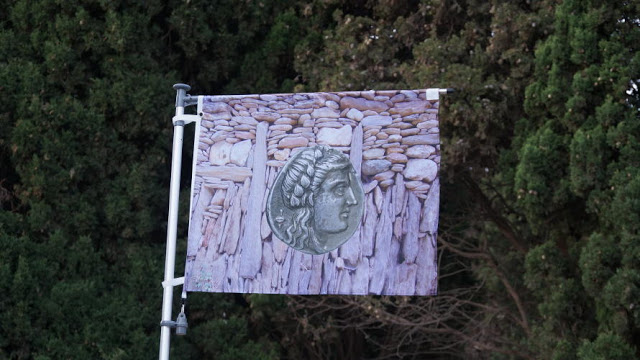 Στο μαρμαράδικο του Ανέστη Χατζηθεοδώρου ο Ιάσονας Καραΐνδρος (jasonkaraindros.net) εγκατέστησε τις οκτώ σημαίες του με υλικά και χρηματικά σύμβολα, μία της Άνδρου, μία της Ελλάδας και άλλων κρατών που έχουν επηρεάσει τη ζωή του νησιού.