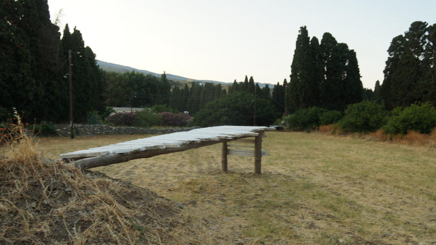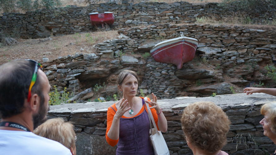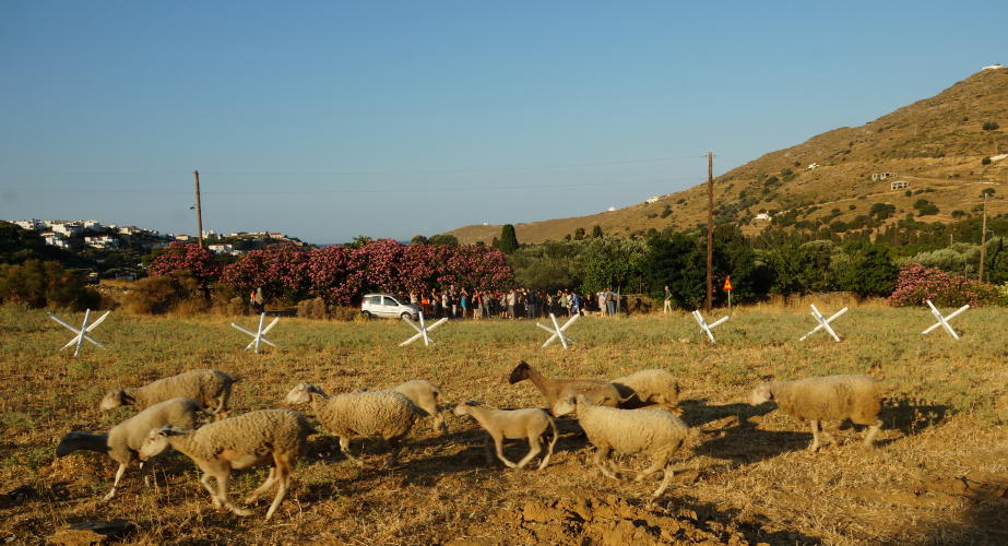 Στο μαρμαράδικο του Ανέστη Χατζηθεοδώρου ο Ιάσονας Καραΐνδρος (jasonkaraindros.net) εγκατέστησε τις οκτώ σημαίες του με υλικά και χρηματικά σύμβολα, μία της Άνδρου, μία της Ελλάδας και άλλων κρατών που έχουν επηρεάσει τη ζωή του νησιού.