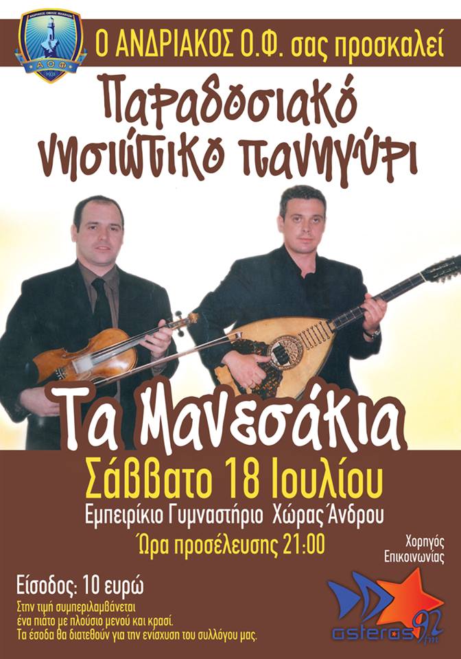 Ο ΑΝΔΡΙΑΚΟΣ Ο.Φ. σας προσκαλεί σε παραδοσιακό πανηγύρι το Σάββατο 18 Ιουλίου στο Εμπειρίκιο Γυμναστήριο Χώρας Άνδρου.