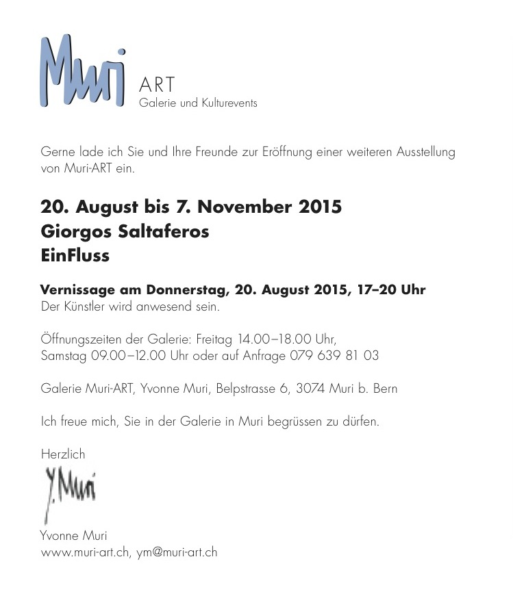 Η απόπειρα εγκιβωτισμού της ρευστότητας του υδάτινου στοιχείου σε λέξεις, μουσική, ή χρώματα αποτελούσε ανέκαθεν ένα τολμηρό εγχείρημα, συνιστά αναμφισβήτητα μια πρόκληση. Σ’ αυτήν την πρόκληση επιχειρεί να ανταποκριθεί ο Γιώργος Σαλταφέρος, αποτυπώνοντας στους πίνακές του τη βαθιά σχέση που εξυφάνθηκε με το νερό της Άαρε όλα τα χρόνια της παραμονής του στη Βέρνη. Πρόκειται για μία ολοκληρωμένη σειρά έργων τα οποία παρουσιάζονται για πρώτη φορά στη γκαλερί Muri-Art.