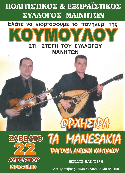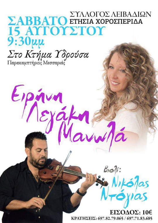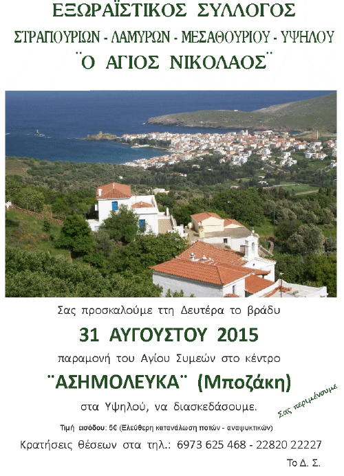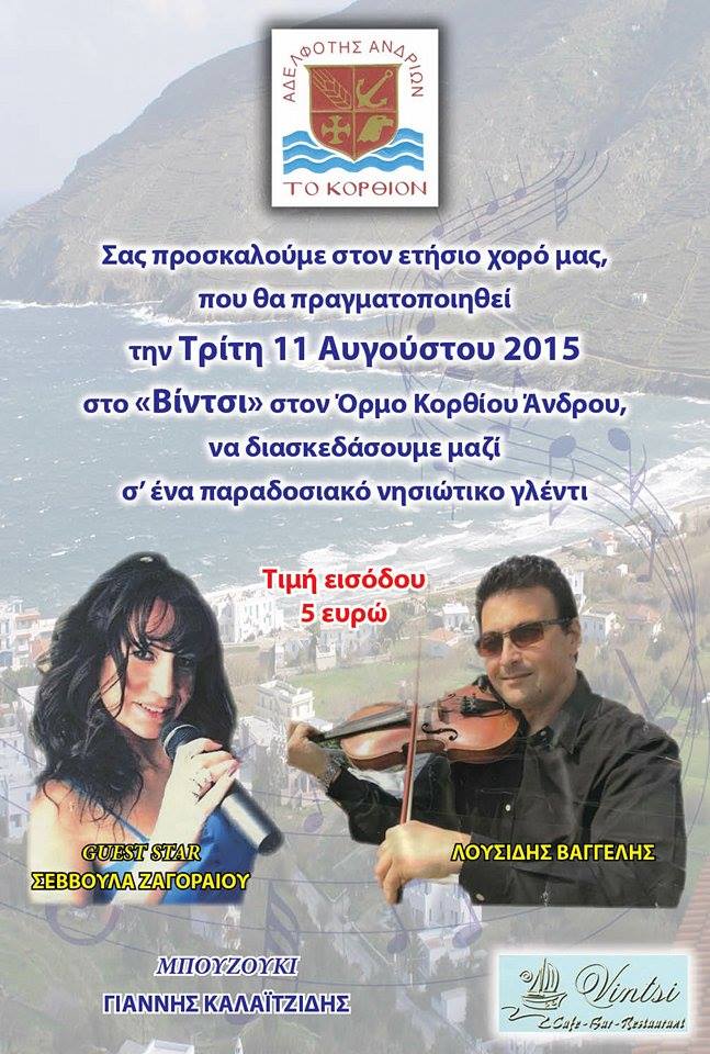 Μαζί μας θα είναι Η Ανδριώτισσα Καλλιτέχνης Μαρία Ζαγοραίου, και το τοπικό Μουσικό Σύνολο, “Ανδριώτικο Τακίμι” με τους Σταύρο Λαρίο, Γιώργο Ρέρρα, και Γιώργο Κατσίκη. Σας περιμένουμε όλους ανήμερα του Δεκαπενταύγουστου να ανταμώσουμε και να γιορτάσουμε μαζί!