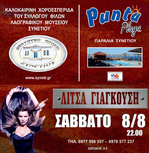 Ο Σύλλογος Φίλων Λαογραφικού Μουσείου Συνετίου, σας προσκαλεί στην Καλοκαιρινή Χοροεσπερίδα του το Σάββατο 08 Αυγούστου, στις 10:00 το βράδυ στο κέντρο Punta Playa (Παραλία Συνετίου)