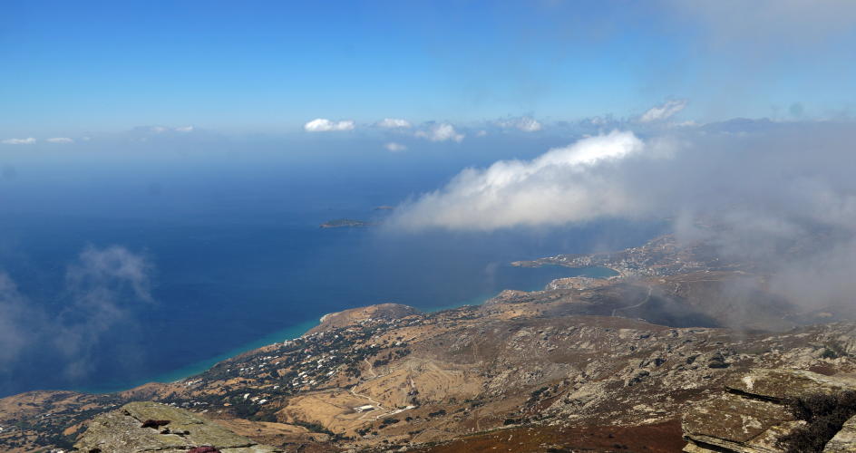 Σε μισή ώρα φθάνεις στην πρώτη κορφή στα 1000 μέτρα. Αυτό που θέλω να πω, είναι ότι πάνω εκεί πάνω αισθάνεσαι ευεξία και ευτυχία.Βλέπεις το νησί ολόκληρο και γύρω – γύρω τη θάλασσα καθώς και το μισό Αιγαίο, ανάλογα πόσο καθαρός είναι ο καιρός. Μπροστά σου έχεις το οροπέδιο το οποίο περπατάς και σε άλλη μισή ώρα φθάνεις και στην επόμενη κορφή των 1000 μέτρων περίπου. Ευχαριστούμε τους καταπατητές κκ Διεθνείς μεγαλοεπιχειρηματίες και τους εδώ αντιπροσώπους τους <ας μη γράψω ονόματα μη φάω και καμιά μύνηση, ευχαριστούμε και τις τοπικές Αρχές που έκαναν τα στραβά μάτια όσο τους ήταν δυνατόν, τους ευχαριστούμε λοιπόν γιατί αυτοί μας άνοιξαν τα μάτια και έκαναν προσβάσιμο αυτό το θεϊκό μέρος.