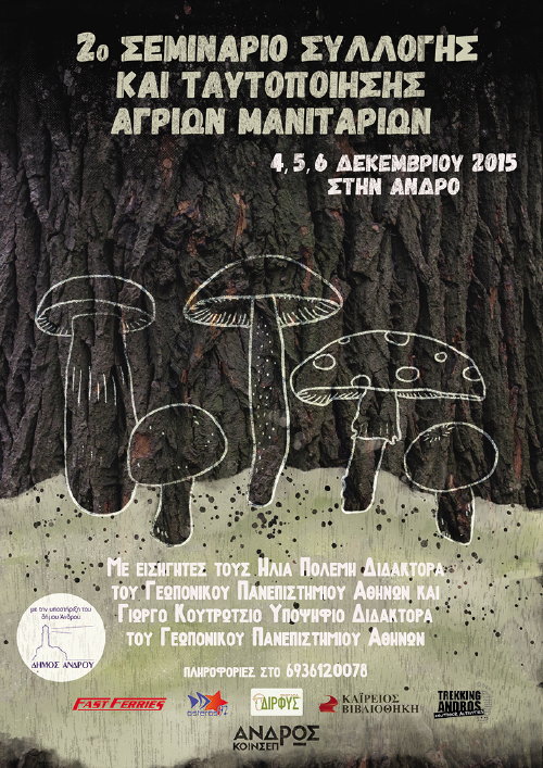 Η Κοινωνική Συνεταιριστική Επιχείρηση Άνδρου (Άνδρος ΚοιΝΣεπ) σας προσκαλεί στο 2ο Σεμινάριο Συλλογής και Ταυτοποίησης Άγριων Μανιταριών που θα πραγματοποιηθεί από την Παρασκευή 4 Δεκεμβρίου 2015 έως και την Κυριακή 6 Δεκεμβρίου για να συλλέξουμε, να ταυτοποιήσουμε αλλά και να γευτούμε άγρια μανιτάρια.