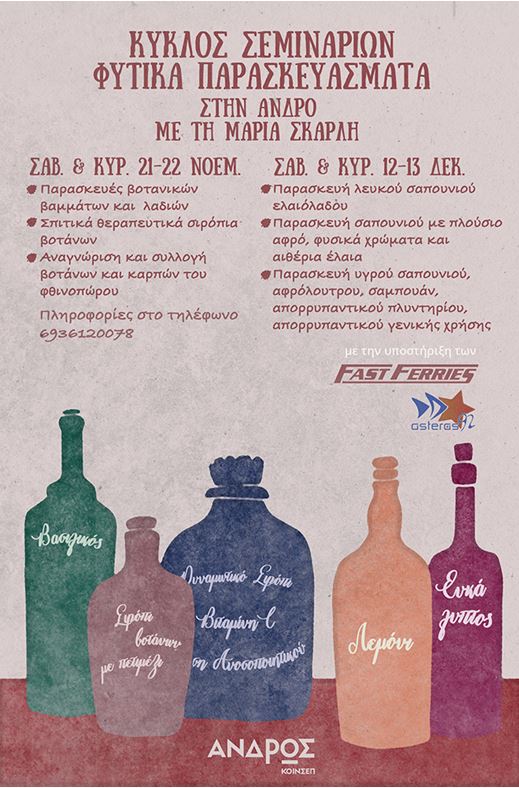 Η Μαρία Σκαρλή, έρχεται για 2η φορά στο νησί μας, για να ολoκληρώσουμε το κύκλο “Φυτικά Παρασκευάσματα”.