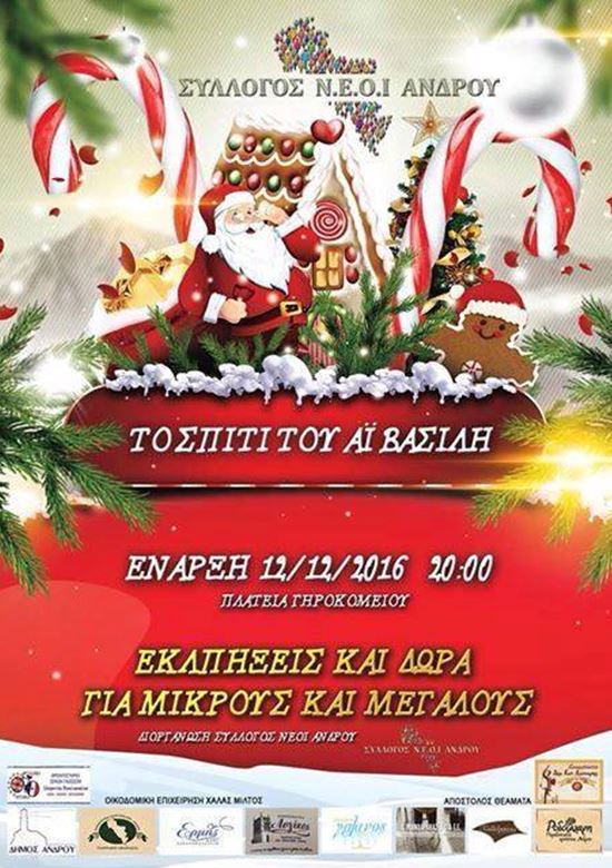 Το σπίτι του Άγιου Βασίλη ανοίγει την πόρτα του και περιμένει όλους τους φίλους του , μικρούς και μεγάλους, από το Σάββατο 12/12/2015 και ώρα 20:00 και για κάθε Κυριακή έως της 27/12/2015. Ελάτε να διασκεδάσουμε , να παίξετε και να φωτογραφηθείτε με τον Άγιο Βασίλη που θα σας περιμένει με δώρα για τα παιδιά αλλά και κληρώσεις για τους μεγάλους.