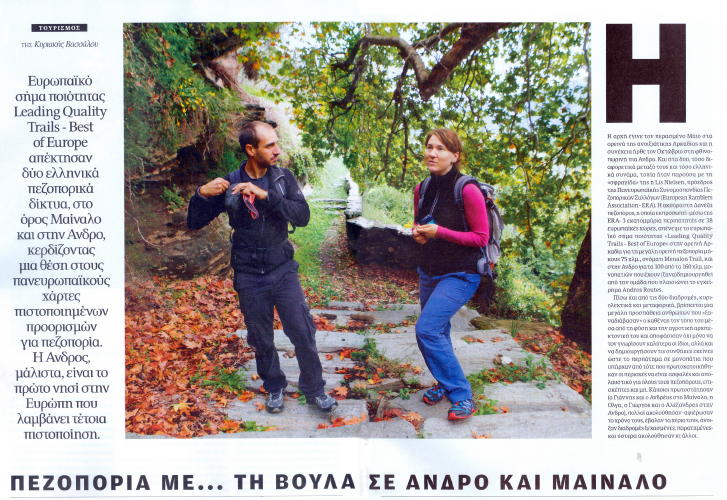 Η ακούραστη Δανέζα πεζοπόρος, η οποία εκπροσωπεί -μέσω της ERA- 3 εκατομμύρια περιπατητές σε 38 ευρωπαϊκές χώρες, απένειμε το ευρωπαϊκό σήμα ποιότητας «Leading Quality Trails – Best of Europe» στην ορεινή Αρκαδία για τη μεγάλη ορεινή πεζοπορία μήκους 75 χλμ., ονόματι Menalon Trail, και στην Ανδρο για τα 100 από τα 160 χλμ. μονοπατιών που έχουν (ξανα)δημιουργηθεί από την ομάδα που πλαισιώνει το εγχείρημα Andros Routes.