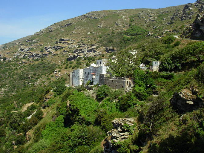 • Από το γραφικό οικισμό ανηφορίζουμε τη δασωμένη πλαγιά του Γερακώνα προς τη Μονή Παναχράντου