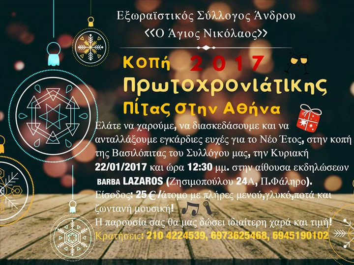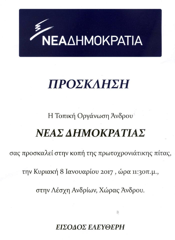 Ο Έπαρχος Άνδρου κ. Δημήτριος Λοτσάρης και οι εργαζόμενοι της Περιφερειακής Ενότητας Άνδρου σας προσκαλούν στην κοπή της Πρωτοχρονιάτικης πίτας που θα πραγματοποιηθεί την Παρασκευή 20 Ιανουαρίου 2017 και ώρα 12.30 στο Γραφείο Επάρχου της Περιφερειακής Ενότητας Άνδρου, κτίριο ΕΟΧΑ Χώρα Άνδρου.
