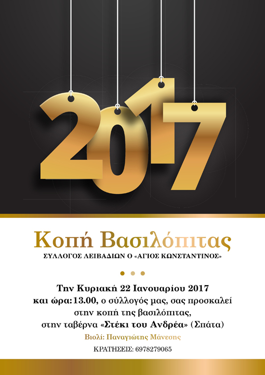 Το Δ.Σ. του συλλόγου Λειβαδίων ο “Αγιος Κωνσταντίνος” σας προσκαλεί το Σάββατο 11 Φεβρουαρίου και ώρα 18.00