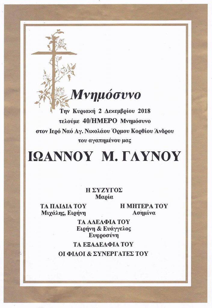 θα τελεστεί το 40 ήμερο μνημόσυνο του Γιάννη Μ. Γλυνού, τέως Δημάρχου  Άνδρου.