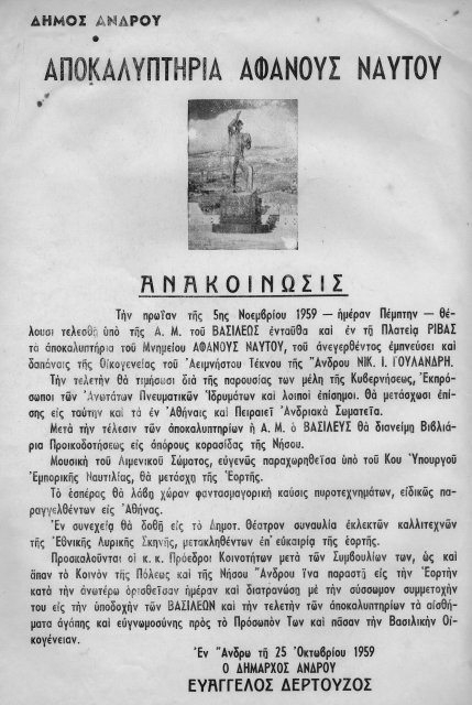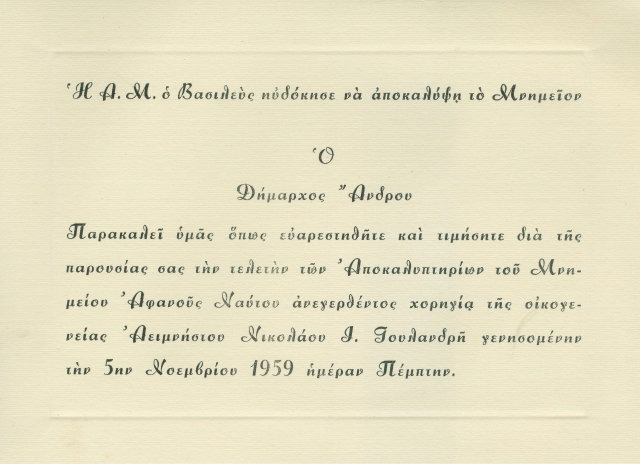 Η πλατεία ήταν έτοιμη το 1958 και για τα αποκαλυπτήρια του Μνημείου ο Δήμος Άνδρου ζήτησε δι’ επιστολών από τα Ανάκτορα όπως η Α.Μ. ο Βασιλεύς επισκεφθεί την νήσον ημών και αποκαλύψει τον ανεγερθέντα ανδριάντα του Αφανούς Ναύτου. Μετά από συνεχή αλληλογραφία ,την 12η Σεπτεμβρίου του1959, ο Μέγας Αυλάρχης  Δημήτριος Ν. Λεβίδης ανακοινώνει στον νέο Δήμαρχον Άνδρου Ευάγγελο Δερτούζον ότι η επίσκεψη του Βασιλέως θα πραγματοποιηθεί την 5ην Νοεμβρίου 1959.